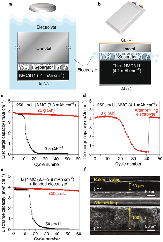 圖2:電池參數(shù)和電池壽命與Li負(fù)極形態(tài)之間的關(guān)系。a,實(shí)驗(yàn)室扣式電池經(jīng)常使用成倍過量的Li和電解液。b,具有多層堆疊電極的高能軟包電池。c-e,具有不同電解液用量(c)的Li || NMC電池的循環(huán)性能,在原始貧電解液被消耗(d)之后補(bǔ)充電解液,電池的循環(huán)性能;不同厚度Li金屬(e)的Li || NMC電池的循環(huán)性能。紅色線代表軟包電池,黑色線代表扣式電池。f,循環(huán)后,Li金屬負(fù)極的厚度變化,開始采用的是厚度為50微米的Li。用于c-e的扣式電池在C/10倍率下循環(huán)2次進(jìn)行化成,然后在2.7-4.4V的電壓范圍內(nèi)以C/3倍率循環(huán)進(jìn)行充放電循環(huán)。
